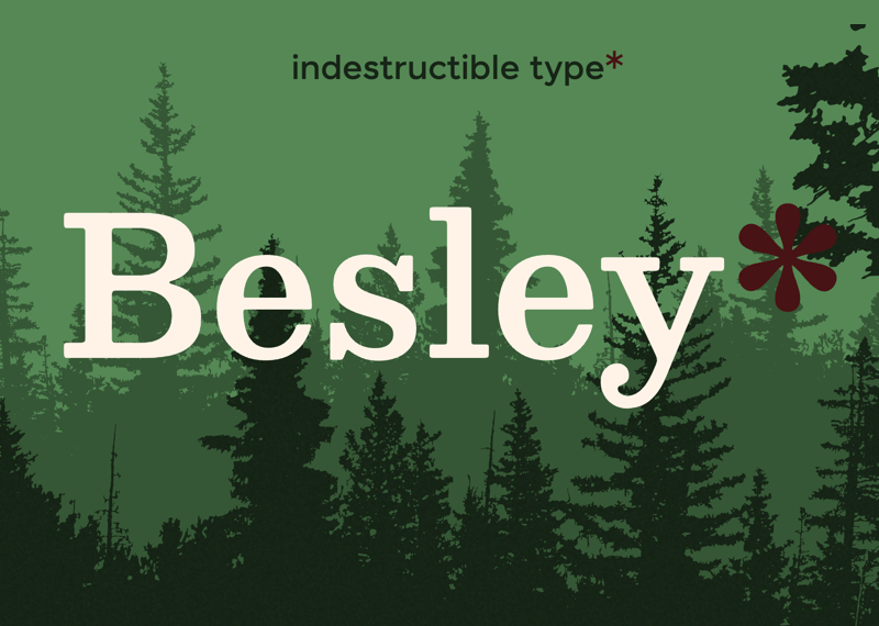Besley* ist eine freie Slab-Serif-Schrift, die von Owen Earl, dem Gründer von indestructible type*, entworfen und gepflegt wird. Sie ist inspiriert von Clarendon, einer beliebten Schrift von Robert Besley.